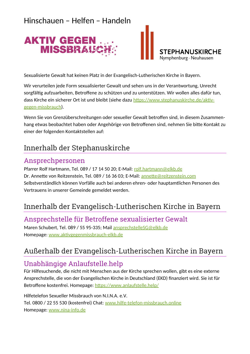 Wir verurteilen jede Form sexualisierter Gewalt und sehen uns in der Verantwortung, Unrecht sorgfältig aufzuarbeiten, Betroffene zu schützen und zu unterstützen. Wir wollen alles dafür tun, dass Kirche ein sicherer Ort ist und bleibt (siehe dazu https://www.stephanuskirche.de/aktiv-gegen-missbrauch).