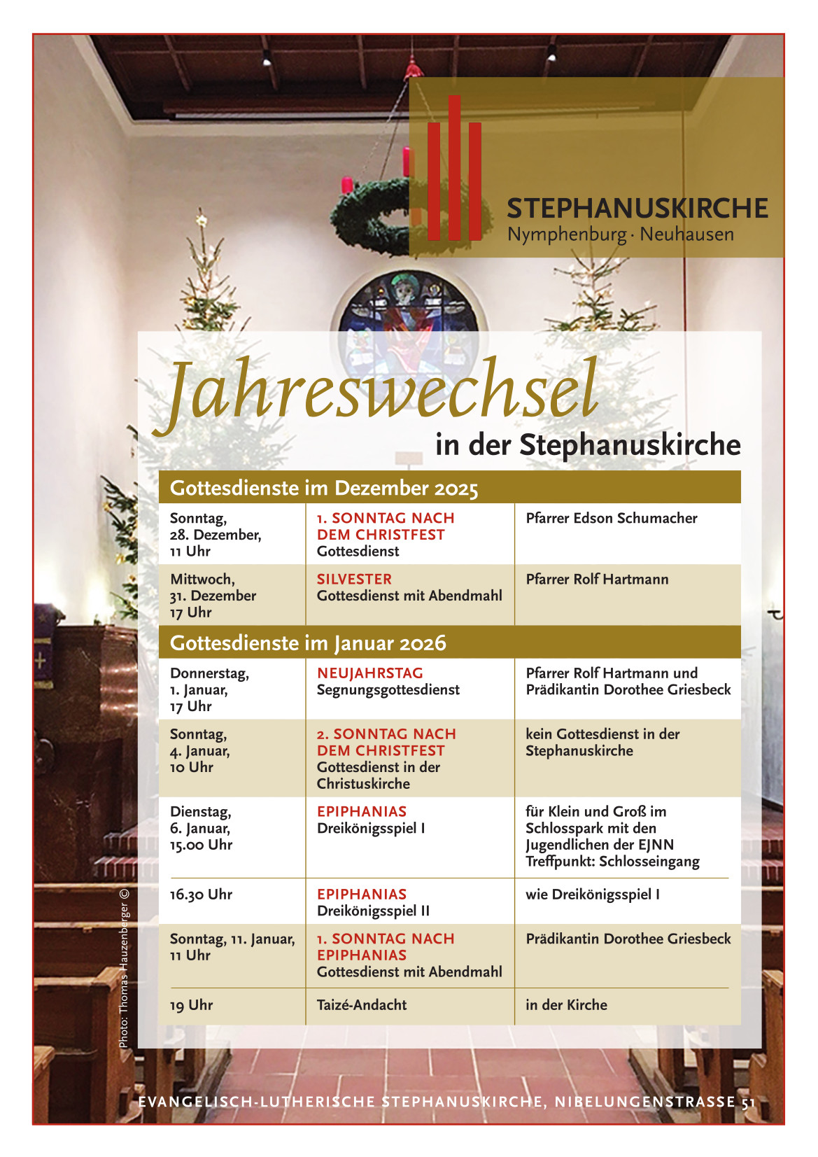 Auch zum Jahreswechsel sowie in der weiteren Weihnachtszeit bis zum Drei-Königs-Fest finden in und um die Stephanuskirche besondere Gottesdienste statt: