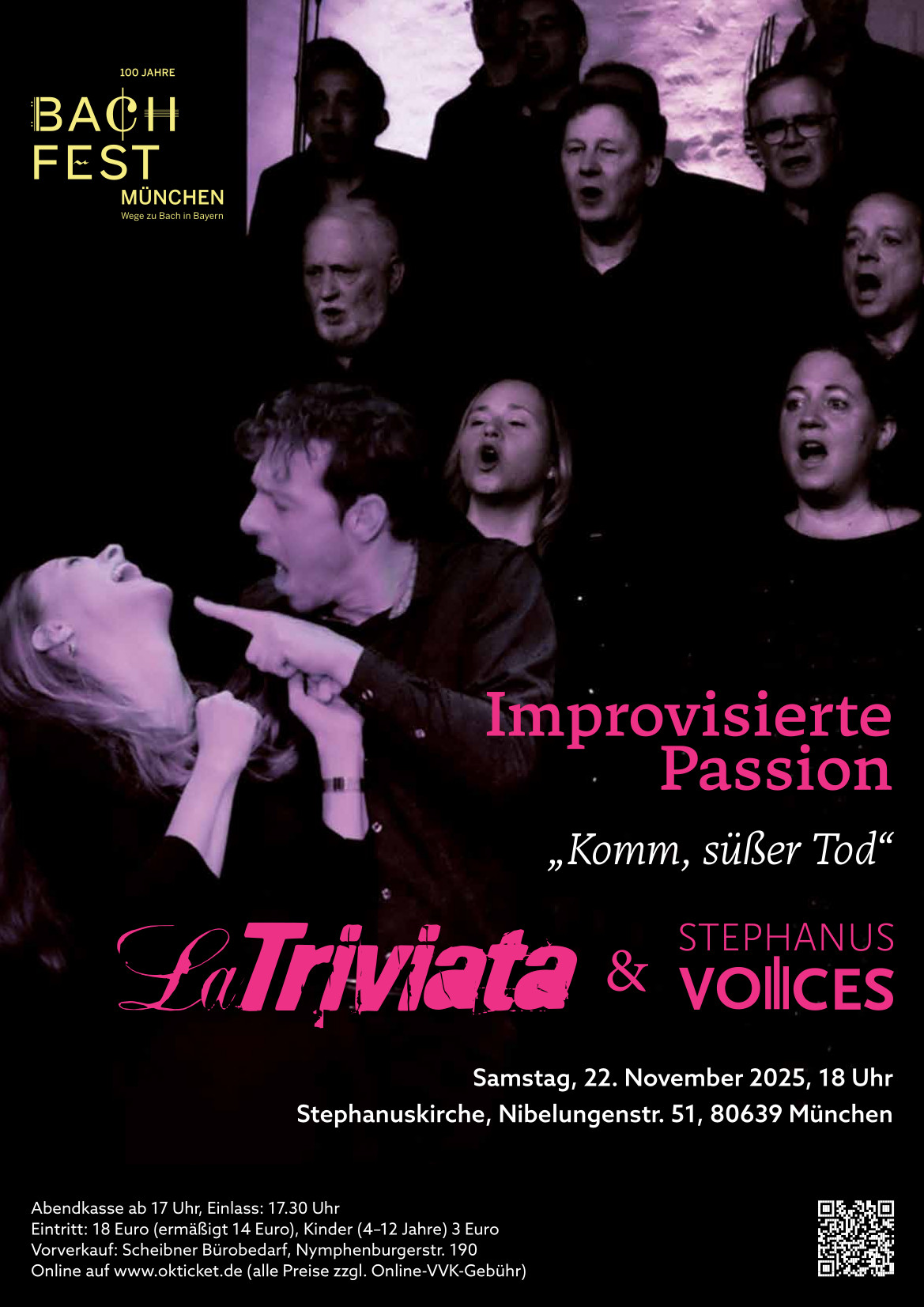 Im Rahmen des diesjährigen Bachfestes findet am Samstag, den 22. November um 18 Uhr in der Stephanuskirche ein musikalisches Erlebnis der besonderen Art statt. Das Ensemble LaTriviata und die Stephanus Voices wagen sich u. a. an eine Neuinterpretation von Johann Sebastian Bachs „Komm, süßer Tod“ – mal im Originalstil, mal völlig überraschend.